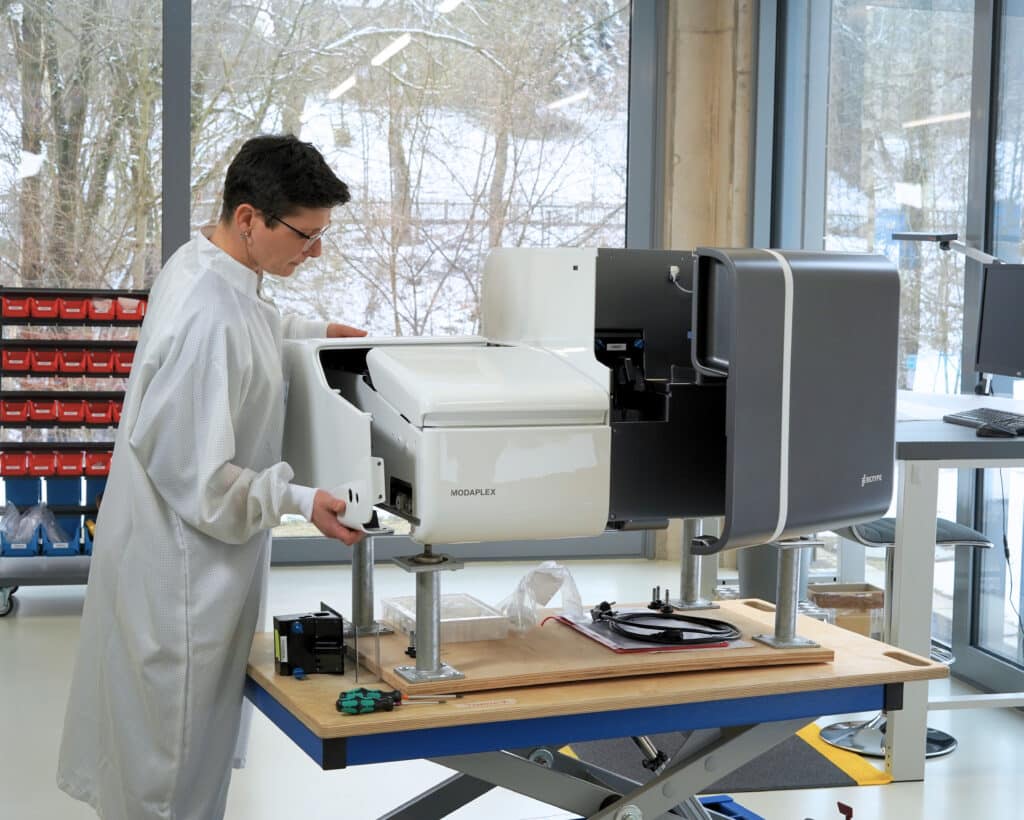 Diese In-vitro-Diagnostikgeräte analysieren Proben aller Art vom oder aus dem Körper und zeichnen sich durch ihre komplexe Funktionsweise aus. So wird beispielsweise für die Multiplex-DNA-Quantifizierung die DNA-Amplifikation (PCR) mit der Kapillarelektrophorese (CE) kombiniert.